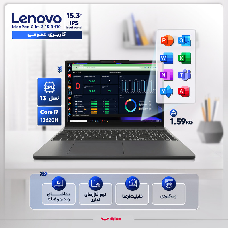 لپ تاپ 15.3 اینچی لنوو مدل IdeaPad Slim 3 15IRH10-i7 13620H-16GB DDR5 4800MHz-512GB SSD-IPS