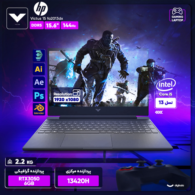 لپتاپ HP Victus 15 fa2013dx در این پیکربندی با پردازنده Core i5‑13420H، کارت گرافیک RTX 3050 و رم 16 گیگابایتی، ساختاری مناسب برای کاربرانی فراهم میکند که به توان پردازشی بالا، نمایشگر سریع و مجموعه پورتهای کامل نیاز دارند. وزن 2.2 کیلوگرم و ابعاد 23.6×264.1×357.8 میلیمتر در کنار بدنه پلاستیکی مستحکم، دستگاه را در رده میانردههای گیمینگ خوشساخت قرار میدهد. طراحی Micro‑Edge باعث شده نسبت صفحهنمایش به بدنه به 82.2 درصد برسد و حاشیهها باریکتر شوند. کیبورد با نور پسزمینه تک رنگ و تاچپد با پشتیبانی از چند لمس، استفاده روزانه را سادهتر میکند.