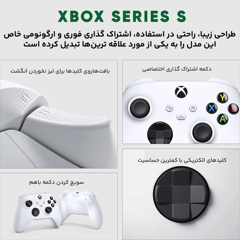 این کنسول از رزولوشن 1440p با قابلیت ارتقا به 4K و فریمریت تا 120 هرتز پشتیبانی میکند و تجربهای روان را به کاربران ارائه میدهد. ایکسباکس سری اس با طراحی بدون دیسک (All-Digital) عرضه شده است، به همین دلیل برای دانلود و اجرای بازیها، به اتصال اینترنت نیاز خواهید داشت و امکان استفاده از بازیهای فیزیکی برای آن وجود ندارد.