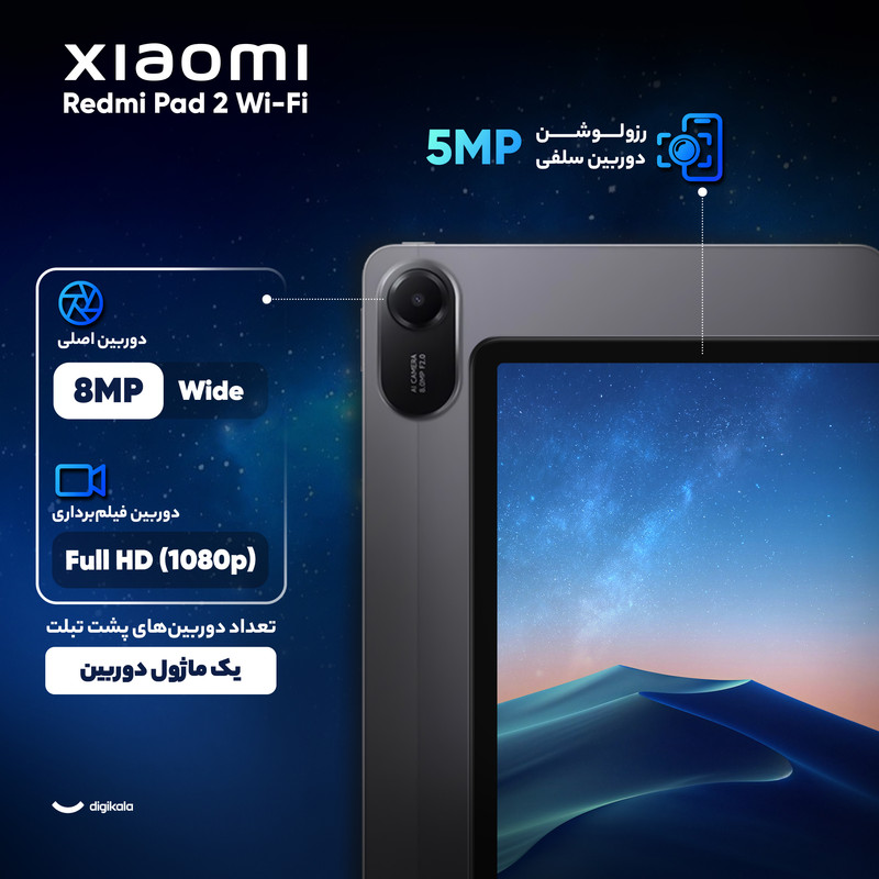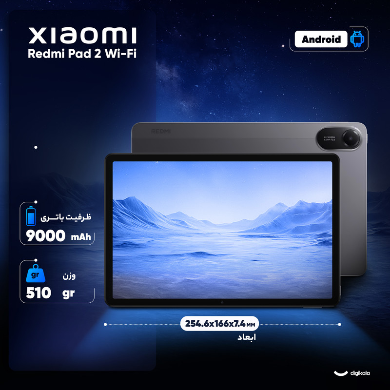تبلت ۱۱ اینچ شیائومی مدل Redmi Pad 2 Wi-Fi با ظرفیت 256 گیگابایت و رم 8 گیگابایت، رزولوشن دوربین اصلی ۸ مگاپیکسل، پشتیبانی از قلم
