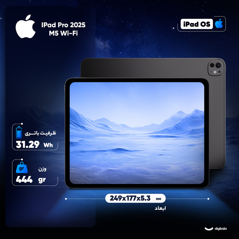 تبلت ۱۱ اینچ اپل مدل iPad Pro 2025 M5 Wi-Fi نسل تازهای از سری حرفهای آیپد است که در اکتبر ۲۰۲۵ معرفی شده و نمایانگر اوج توان پردازشی و طراحی مینیمال اپل در یک بدنهی سبکوزن و تمامفلزی است. این محصول با ضخامت تنها ۵.۳ میلیمتر و وزن ۴۴۴ گرم، یکی از باریکترین و ظریفترین تبلتهای ردهبالا محسوب میشود و با ترکیب شیشه در بخش جلو و آلومینیوم در فریم و پشت، کیفیت ساخت ممتاز و مقاومی ارائه میدهد. صفحهنمایش ۱۱ اینچی Ultra Retina Tandem OLED با نرخبهروزرسانی ۱۲۰ هرتز، روشنایی حداکثر ۱۶۰۰ نیت و نسبت کنتراست خیرهکنندهی ۲,۰۰۰,۰۰۰:۱، تجربهی بصری فوقالعادهای را برای کاربر فراهم میکند. پشتیبانی از فناوریهای HDR10، Dolby Vision و ProMotion سبب شده جزئیات تصویر در این نمایشگر، چه در حالت SDR و چه HDR، با وضوح خیرهکننده به نمایش درآید.