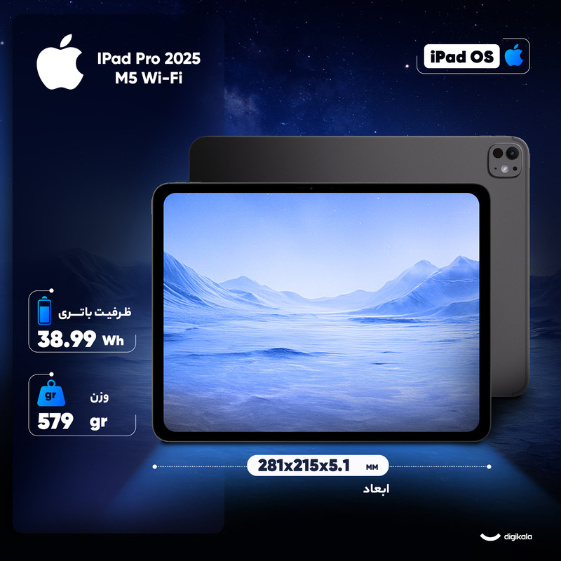 تبلت ۱۳ اینچ اپل مدل iPad Pro 2025 M5 Wi‑Fi نسخهای کاملاً حرفهای از نسل جدید آیپدهای اپل است که با طراحی باریکتر، صفحهنمایش خیرهکننده و قدرت پردازشی بیرقیب، مرز میان تبلت و لپتاپ را بار دیگر جابهجا کرده است. بدنهی فلزی با ساختار یکپارچهی آلومینیومی در کنار ضخامت تنها ۵.۱ میلیمتر، ظاهری مدرن و درعینحال مقاوم به این محصول بخشیده و وزن ۵۷۹ گرمی آن باعث شده علیرغم نمایشگر بزرگ، کاربردی و خوشدست باقی بماند.