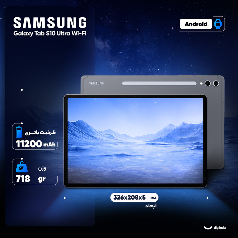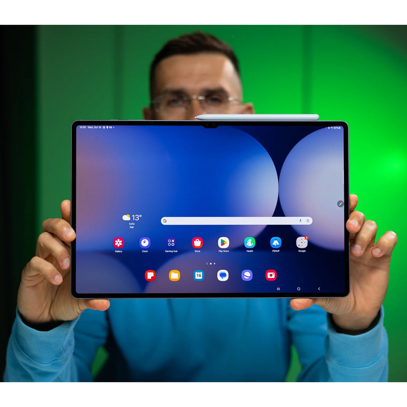تبلت سامسونگ Galaxy Tab S10 Ultra Wi‑Fi با نمایشگر 14.6 اینچی، یکی از کاملترین تبلتهای حرفهای بازار در سال 2024 است که ترکیبی از قدرت سختافزاری، طراحی ممتاز و امکانات پیشرفته را ارائه میدهد. بدنه تمامفلزی آن با ضخامت تنها 5 میلیمتر و وزن 718 گرم، حس استحکام و سبکی را همزمان به همراه دارد. این دستگاه استاندارد IP68 را برای مقاومت در برابر آب و گردوغبار دریافت کرده و میتواند تا عمق 1.5 متر برای 30 دقیقه در برابر نفوذ آب مقاوم بماند.