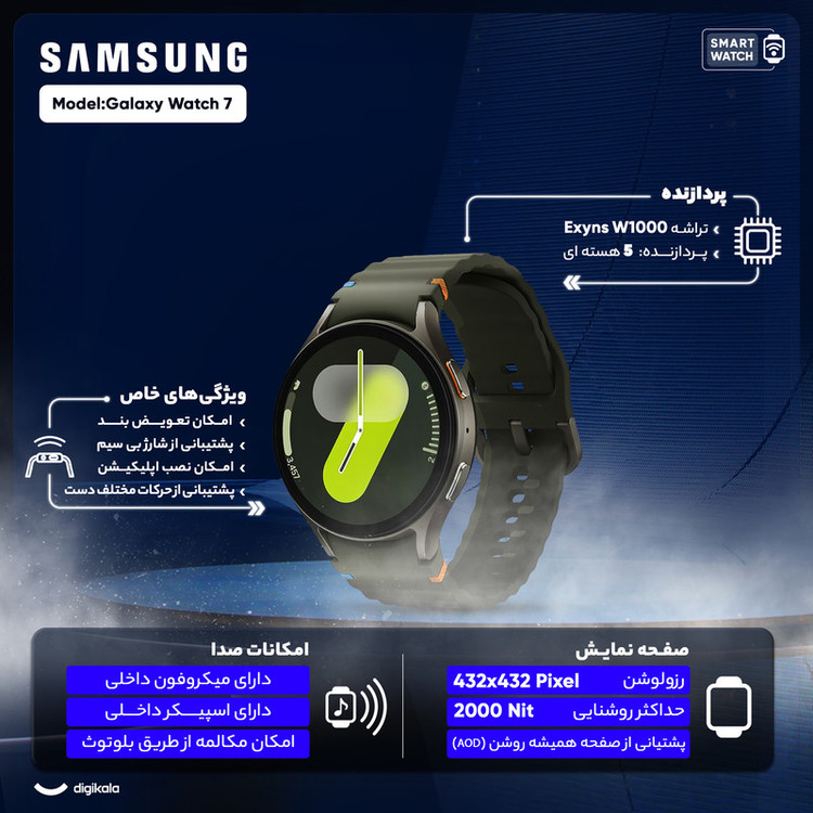 قابلیتهای ساعت هوشمند : کنترل موسیقی (Music Player) , قابلیت مکالمه از طریق بلوتوث , قابلیت تغییر طرح ساعت یا تم , صفحه همیشه روشن (Always-on Display) , پشتیبانی از دستیار صوتی