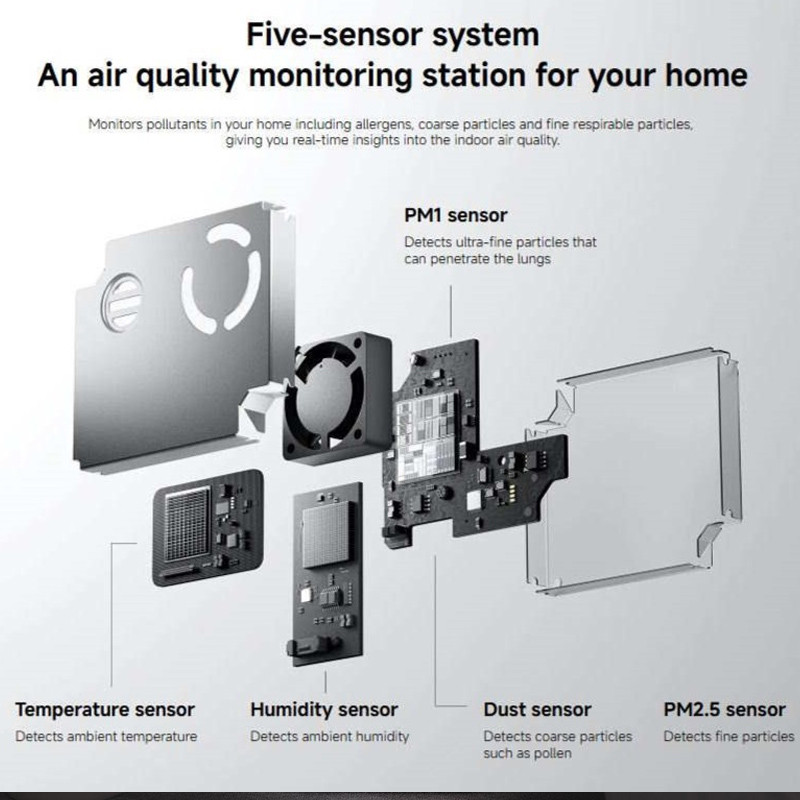 ،Temperature sensor، Humidity sensor، Dust sensor و PM2.5 sensor)، فیلتر پنجلایه با نور UVC، پشتیبانی از فرمانهای صوتی Google Assistant و Amazon Alexa است که نیاز مخاطب در هر زمینه ای را به خوبی پوشش می دهد.