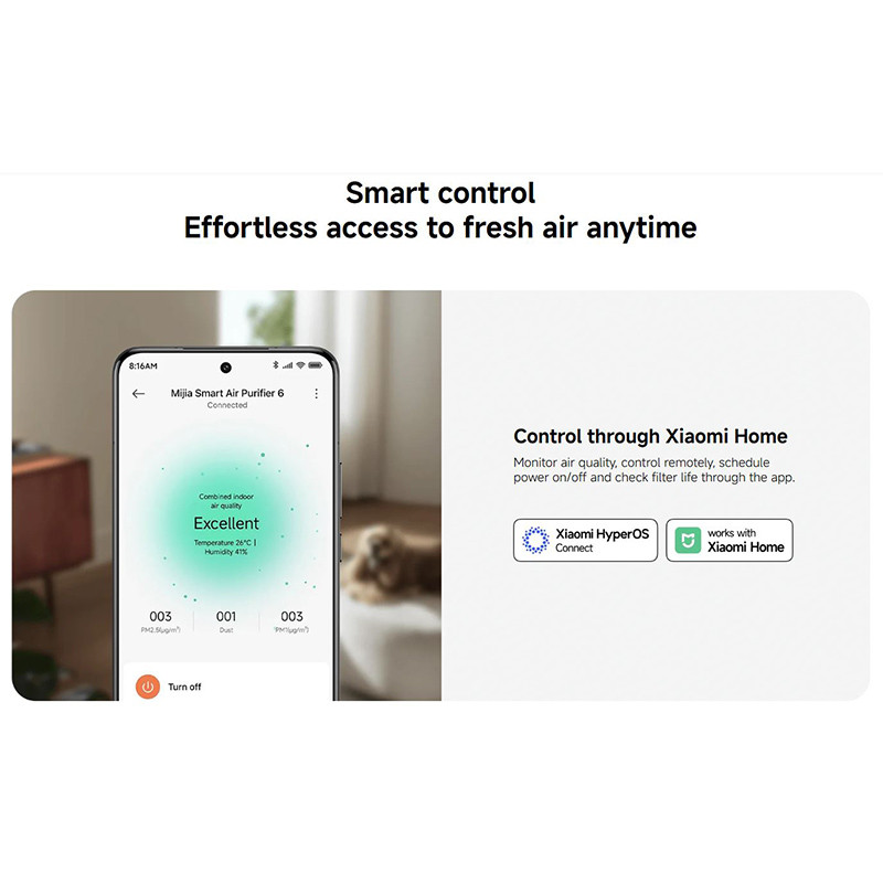 نمایشگر رنگی دستگاه، اطلاعات کاملی از وضعیت و کیفیت فعلی هوا را نمایش میدهد و به این ترتیب همیشه می دانید در چه شرایطی تنفس می کنید. یکی از جذابترین ویژگیهای این تصفیههوا، قابلیت کنترل از راه دور از طریق اپلیکیشن Xiaomi Home است. کاربران میتوانند به راحتی کیفیت هوای خانه را بررسی کرده، دستگاه را روشن یا خاموش کنند، زمانبندی تنظیم نمایند یا وضعیت فیلتر را چک نمایند.