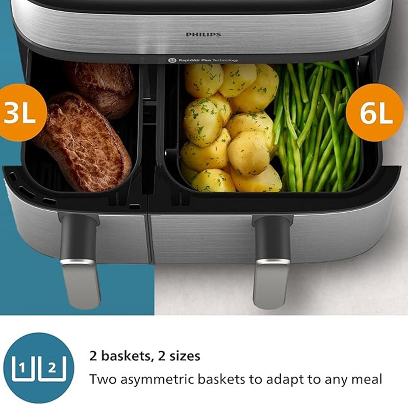 در بخش عملکرد، هواپز 9 لیتر فیلیپس مدل NA555/09 از فناوریهای پیشرفته RapidAir Plus و Air Steam بهره میبرد که ترکیب جریان هوای گرم با بخار را ممکن میسازد. این ساختار نهتنها باعث پخت یکنواخت و سریعتر میشود، بلکه رطوبت داخلی غذا را حفظ کرده و از خشک شدن گوشت، ماهی یا سبزیجات جلوگیری میکند. دستگاه دارای دو سبد مجزا شامل یک سبد ۶ لیتری و یک سبد ۳ لیتری است که امکان پخت دو نوع غذا را بهصورت همزمان و با تنظیم دما و زمان مستقل برای هر محفظه فراهم میسازد. یکی از سبدها مجهز به قابلیت بخارپز است و این ویژگی برای افرادی که به تغذیه کمچرب و سالم اهمیت میدهند بسیار ارزشمند است. وجود ۱۲ برنامه پخت پیشفرض نیز فرآیند آمادهسازی غذاهای متفاوت را سادهتر و سریعتر میکند.